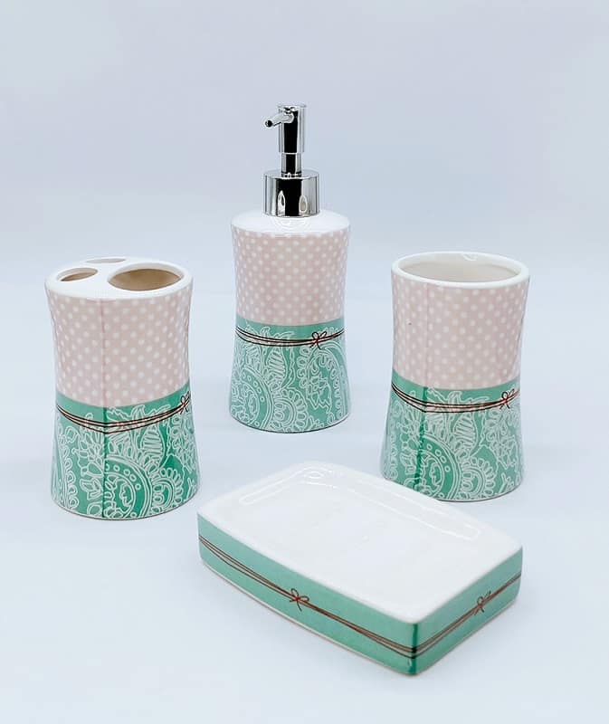 Begin decorating your bathroom with these beautiful set of one mug, a soap dish, a toothbrush holder, and a soap dispenser.